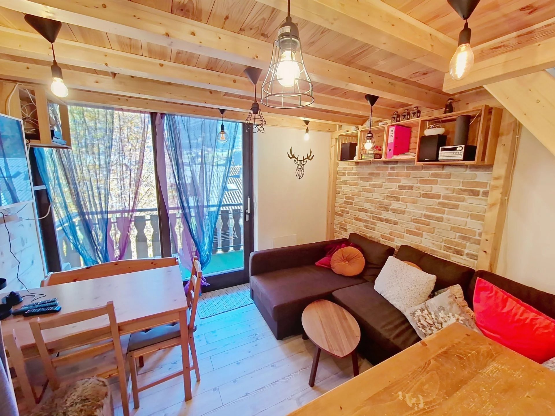 It is composed of an entrance with cupboards, a shower-room with WC, a livingroom with a fitted kitchenette and balcony access ; 2 bedrooms upstairs