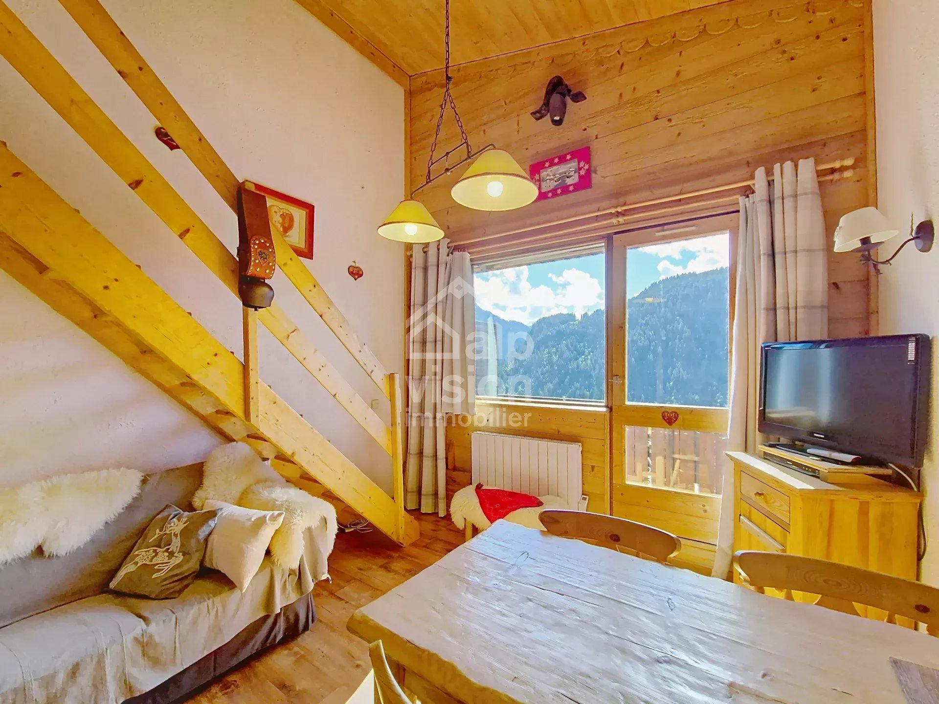 In the French Alps, this cosy 46 m² apartment (with 21 m² under 1.80 m) is located on the 2nd floor of a chalet-style residence (114 lots spread over 7 residences), built in 1980 with magnificent views over the valley