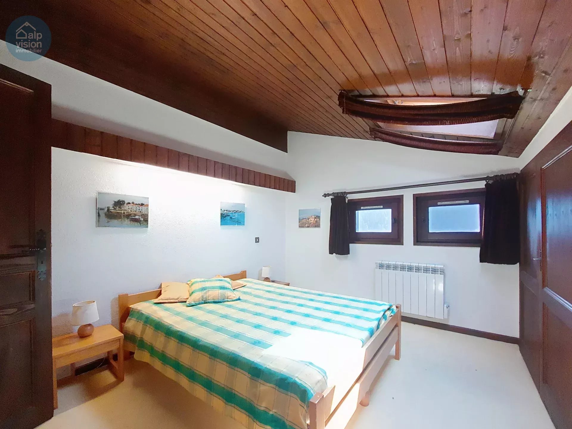fitted kitchen and South/West balcony acces; upstairs : 2 bedrooms, a bathroom and
