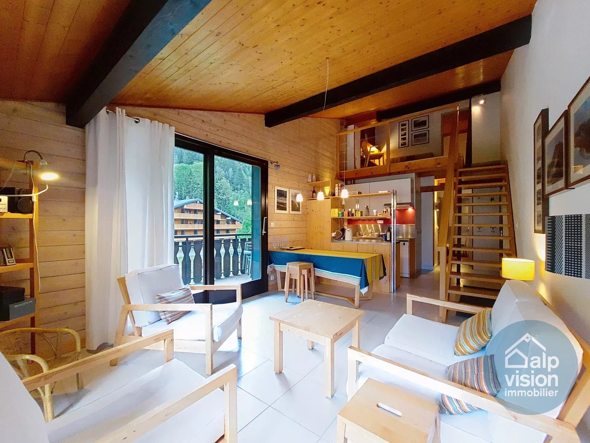 It is composed of an entrance with cupboards, shower-room, separat WC, large bedroom , large livingroom with a fitted kitchenette and 2 balconies access ; mezzanine and bedroom upstairs.