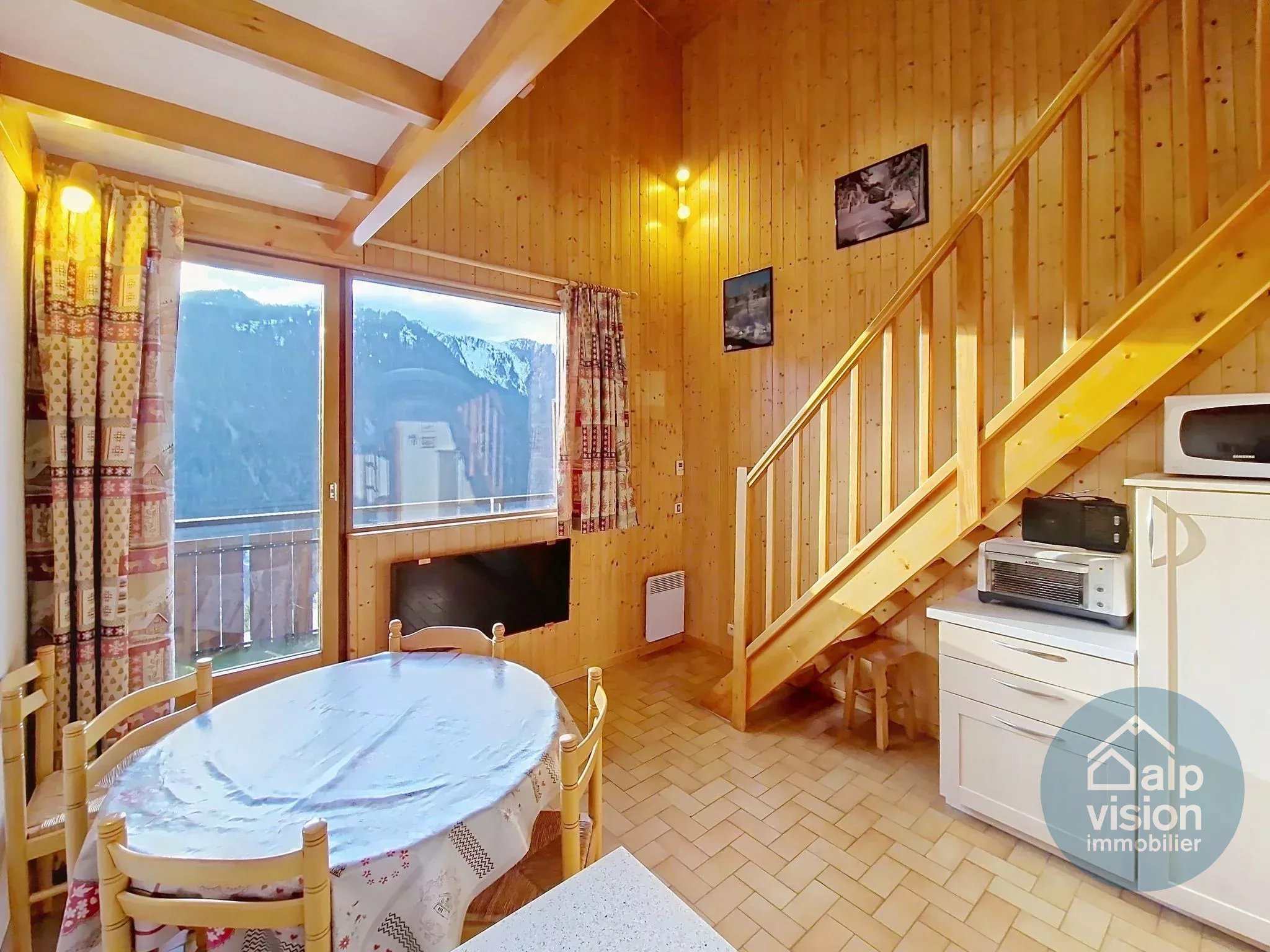 Il se compose d'une entrée avec dégagement et placards, un coin montagne, une salle d'eau avec douche, un WC indépendant, un séjour avec kitchenette équipée et accès balcon orienté Sud/Ouest; une mezzanine et une chambre à l'étage complètent cet appartement. Vendu meublé avec une cave et un casiers à skis