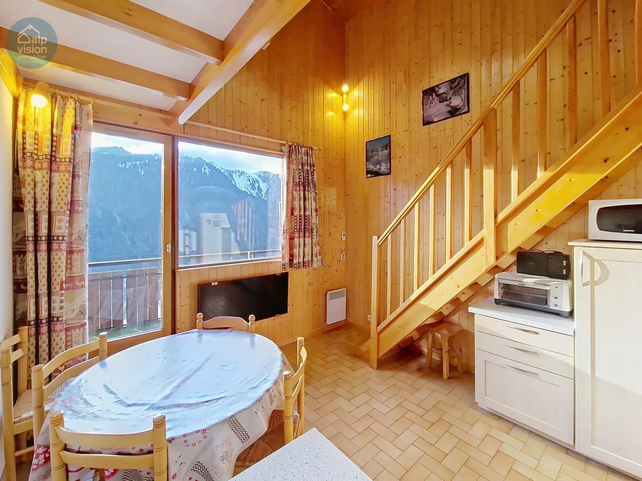 Il se compose d'une entrée avec dégagement et placards, un coin montagne, une salle d'eau avec douche, un WC indépendant, un séjour avec kitchenette équipée et accès balcon orienté Sud/Ouest; une mezzanine et une chambre à l'étage complètent cet appartement. Vendu meublé avec une cave et un casiers à skis