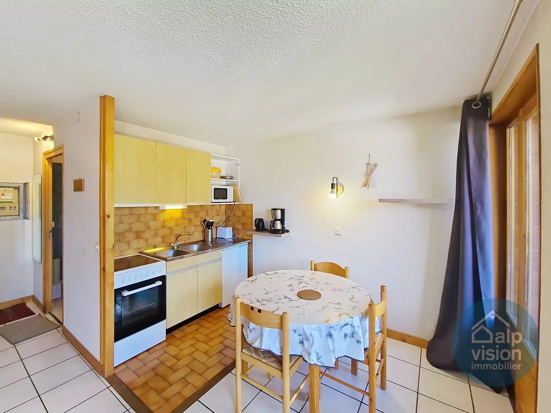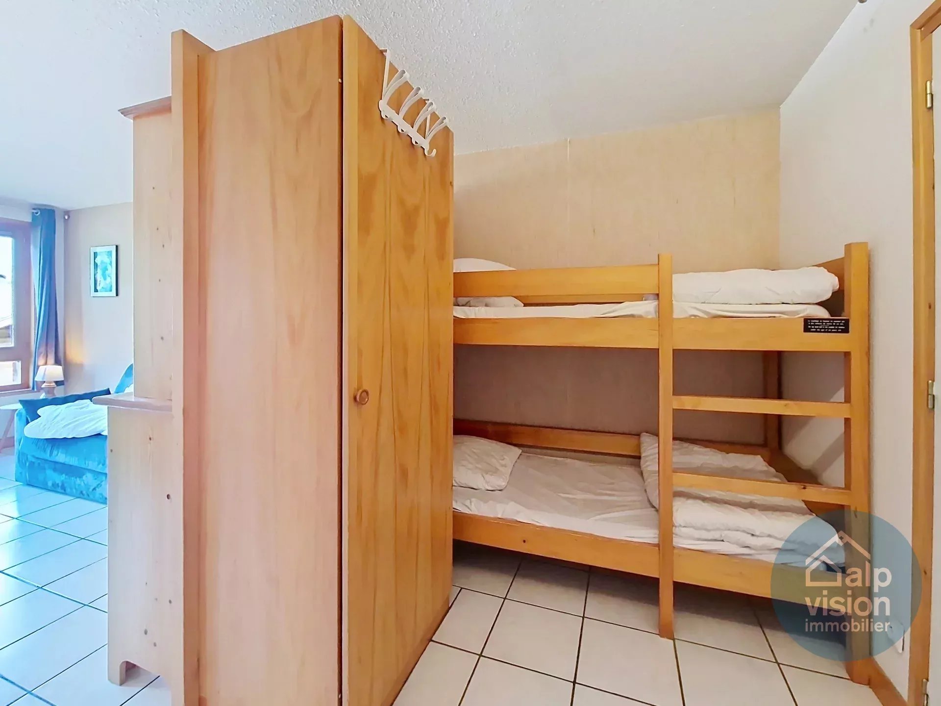 Il se compose d'une entrée avec coin montagne, une salle de bains avec WC, un séjour avec kitchenette équipée et accès balcon orienté Sud/Ouest.