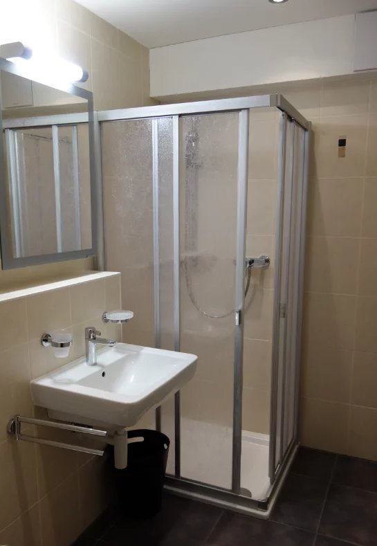 - 1 chambre double avec portes-fenêtres et armoires encastrées, salle de douche attenante avec douche et wc