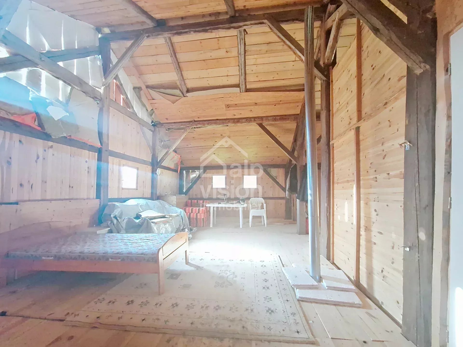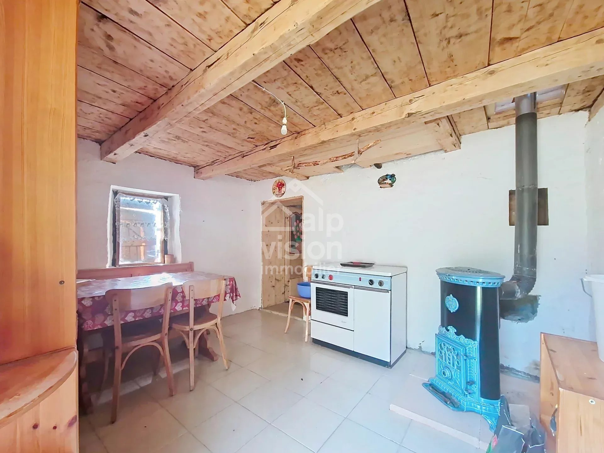 Il se compose de trois pièces en rez-de-chaussée, une grange à l'étage et une cave.